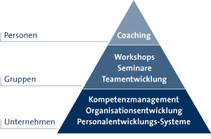 AngebotAus welcher Perspektive Sie sich dem Thema Personal- und Organisationsentwicklung auch nähern, als Mitarbeiter, Führungskraft oder Personalentwickler, als Team, Unternehmensbereich oder ganzes Unternehmen, wir beraten und unterstützen Sie mit modernen Instrumenten und Konzepten. Vom Einzelcoaching bis hin zur Implementierung komplexer Instrumente zur Personalentwicklung profitieren Sie von unserer langjährigen Erfahrung und unseren kreativen Ideen. |
